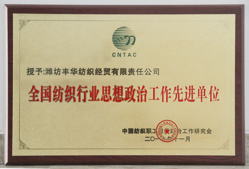 11月8日—10日,中國紡織職工思想政治工作研究會第五次會員大會暨全國紡織行業黨建和誠信文化建設工作交流會在河南西平召開。會上對全國紡織行業黨建和思想政治工作優秀單位、先進個人進行了表彰,豐華(集團)公司獲得“全國紡織行業黨建工作先進企業”和“全國紡織行業思想政治工作先進單位”兩項榮譽。
